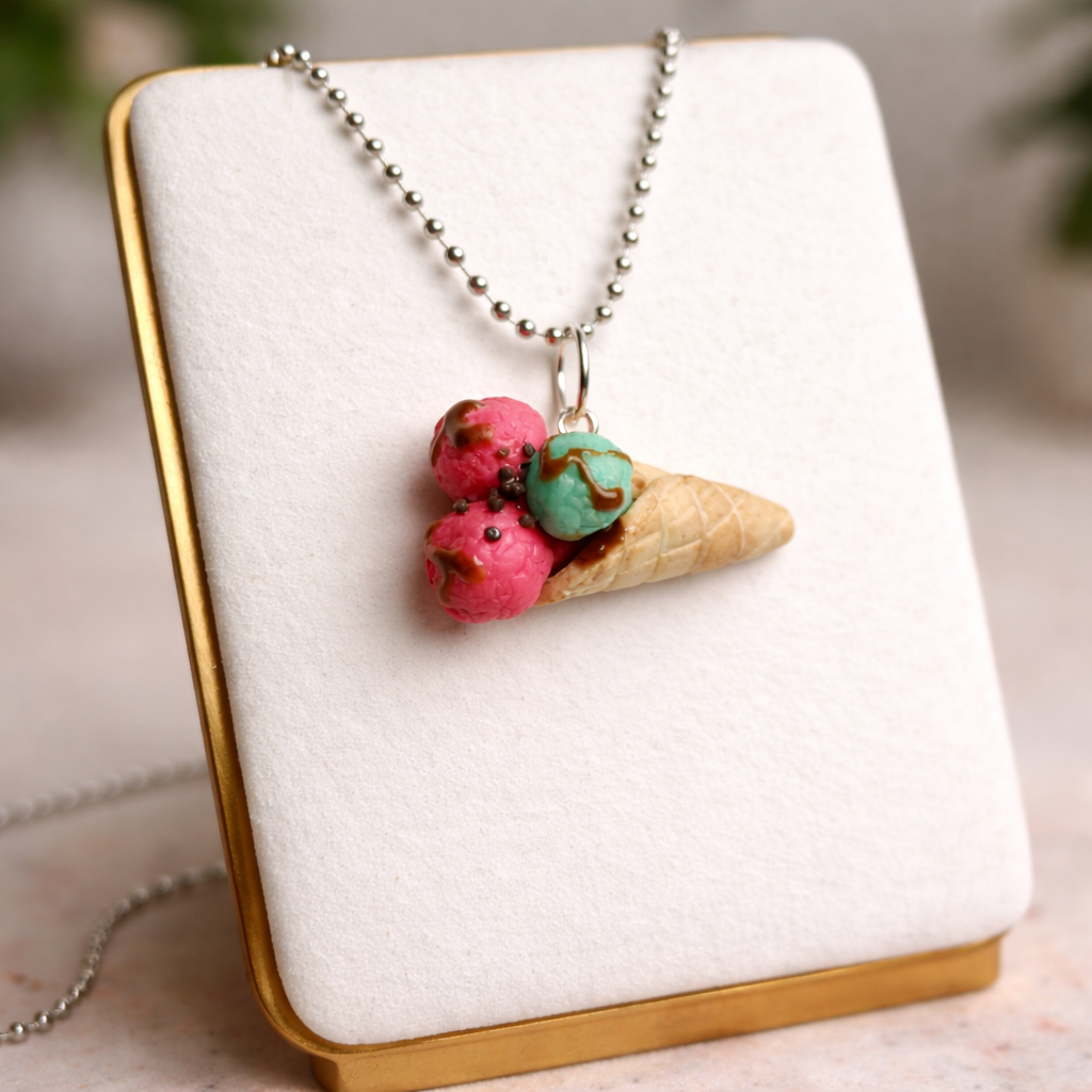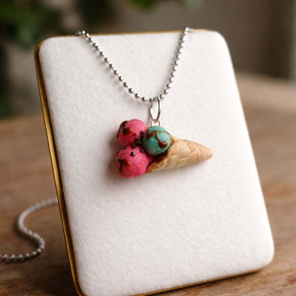 Indulge your love of all things sweet with this handmade strawberry ice cream necklace, designed to look just like a delicious triple-scoop treat! Carefully sculpted from high-quality polymer clay, this miniature dessert pendant features vibrant strawberry scoops with realistic texture, chocolate drizzle detailing, and a classic waffle cone finish.